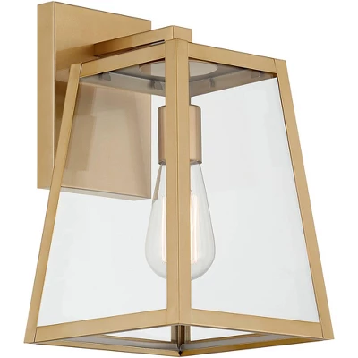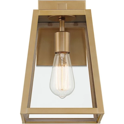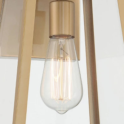 Brighten up your home’s exterior with this handsome outdoor wall light from the Arrington collection by John Timberland. This updated industrial design comes in a tapering soft gold finish frame with a sleek, straight-lined look. Clear glass panels offer a full view of the beautiful vintage Edison style bulb that is included with purchase. Wet location outdoor rated. Vertical installation and wall mount only.