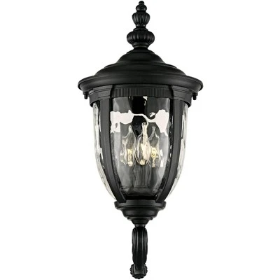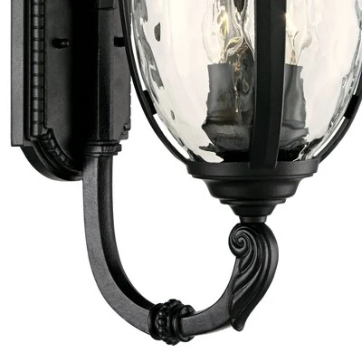 Inspired by traditional European lighting designs, this outdoor wall light is a beautiful choice for your porch or patio space. It comes in a texturized black finish over a sturdy die-cast metal construction and features clear hammered glass for an elegant, refined look. A scrolling upbridge arm adds a great decorative touch. From the Bellagio collection by John Timberland.