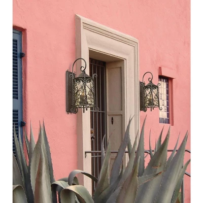 Add a touch of classic Spanish style to your home with this fixture. From the Casa Seville collection, this charming outdoor wall light serves as a warm accent piece. It comes in a classy design with champagne water glass, covered with a dark walnut frame with decorative scrolls and metal twist details.