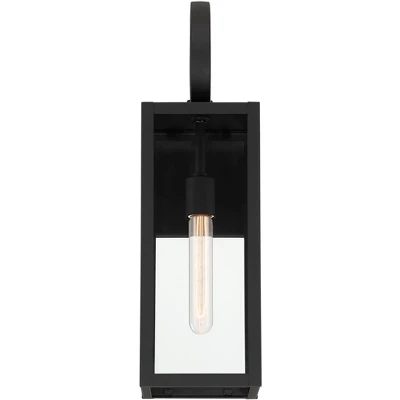 Style combines with clean minimalist lines in the Mira collection of outdoor wall lights from the John Timberland brand embraces contemporary confidence. Coated in a deep black finish, this rectangular design uses clear glass panels to showcase the vibrant bulb within. A gentle scrolling curl adds an eye-catching top to this modern fixture.