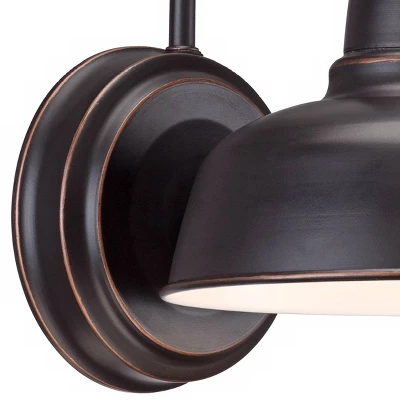 From the Urban Barn collection by John Timberland, this indoor-outdoor wall light comes in a charming industrial farmhouse style. The steel frame features a wide downlight shade attached to the end of a thin, arching gooseneck arm. An oil rubbed bronze finish adds a handsome rustic touch. Perfect for use in a porch or patio area.
